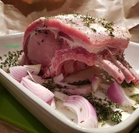 In case you haven’t scored the skin, then just rub the pork loin with olive oil and sprinkle liberally with the salt and fresh thyme!