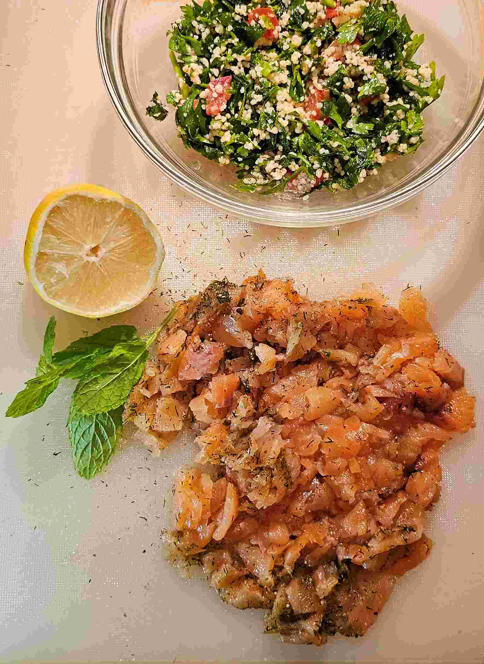 Versatility: Serve it as an elegant main dish for a casual luncheon or make smaller balls for elegant appetizers; either as per photos below, but you can also opt for an even easier way to serve this dish by chopping up the smoked salmon, or if you prefer cured salmon, and mixing it in with the Tabouli and turning the mixture into small balls.